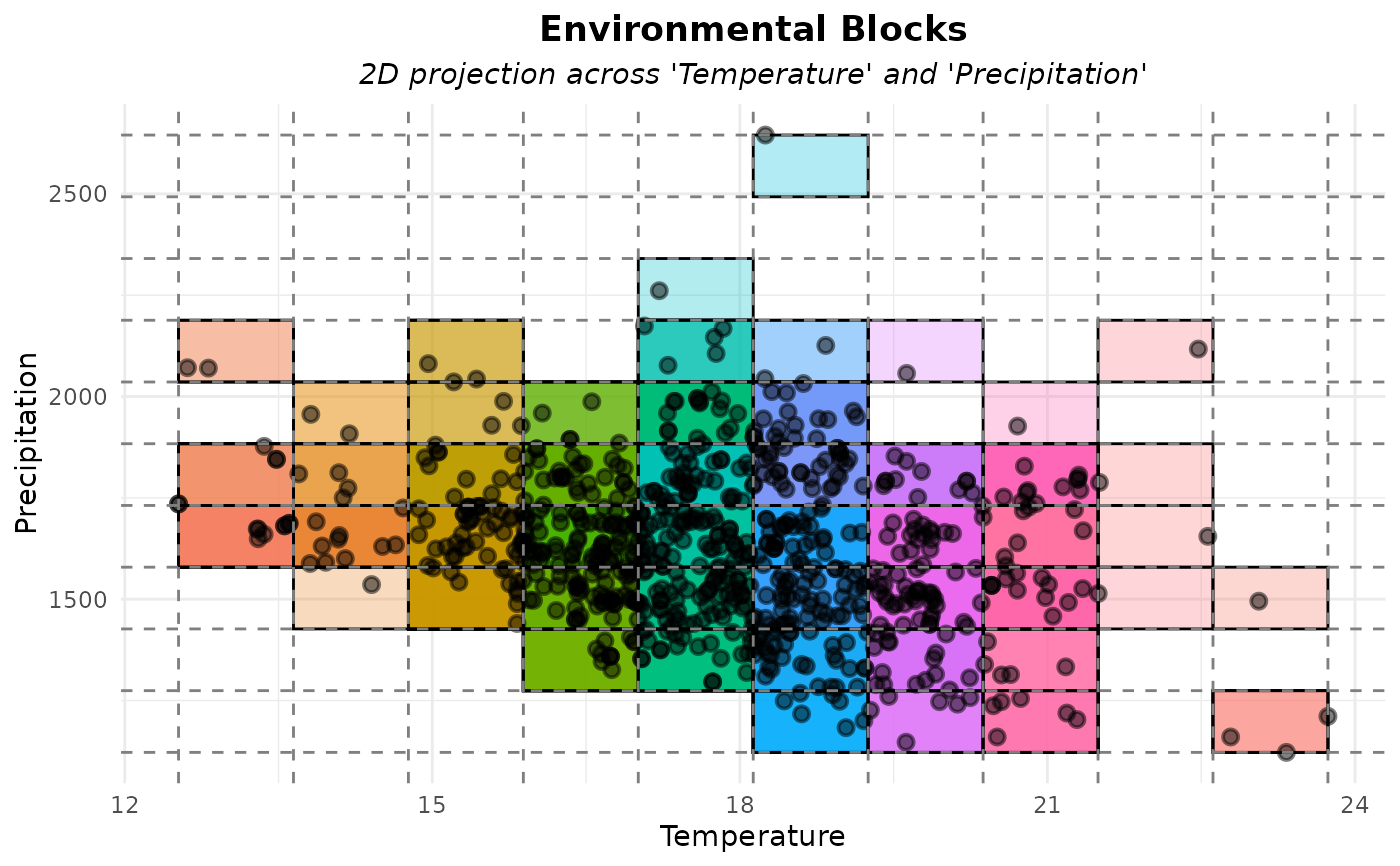 A ggplot object showing the environmental blocks (colored rectangles) and the occurrence records in the selected environmental space.